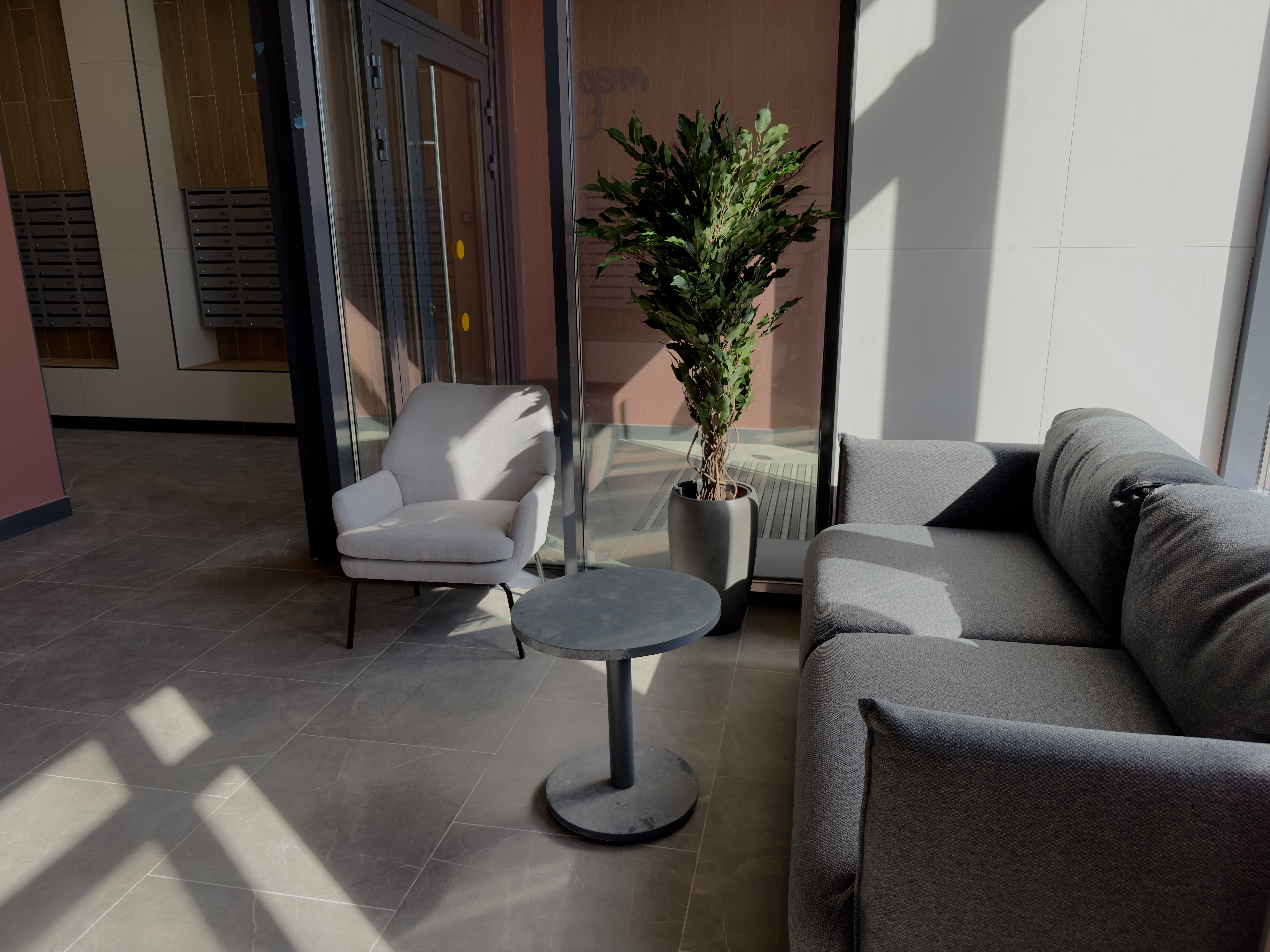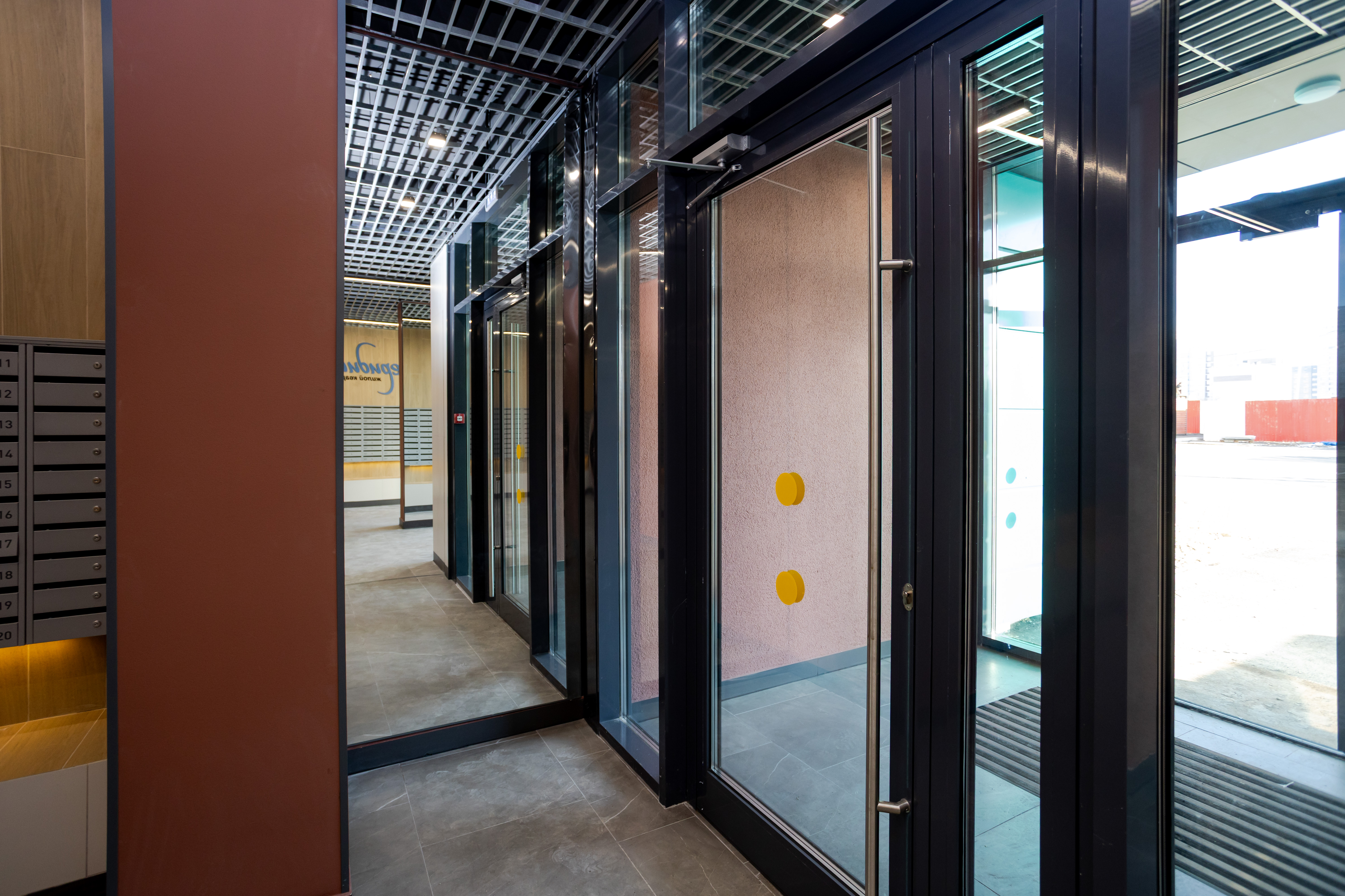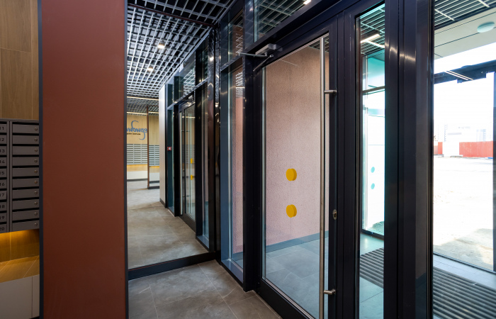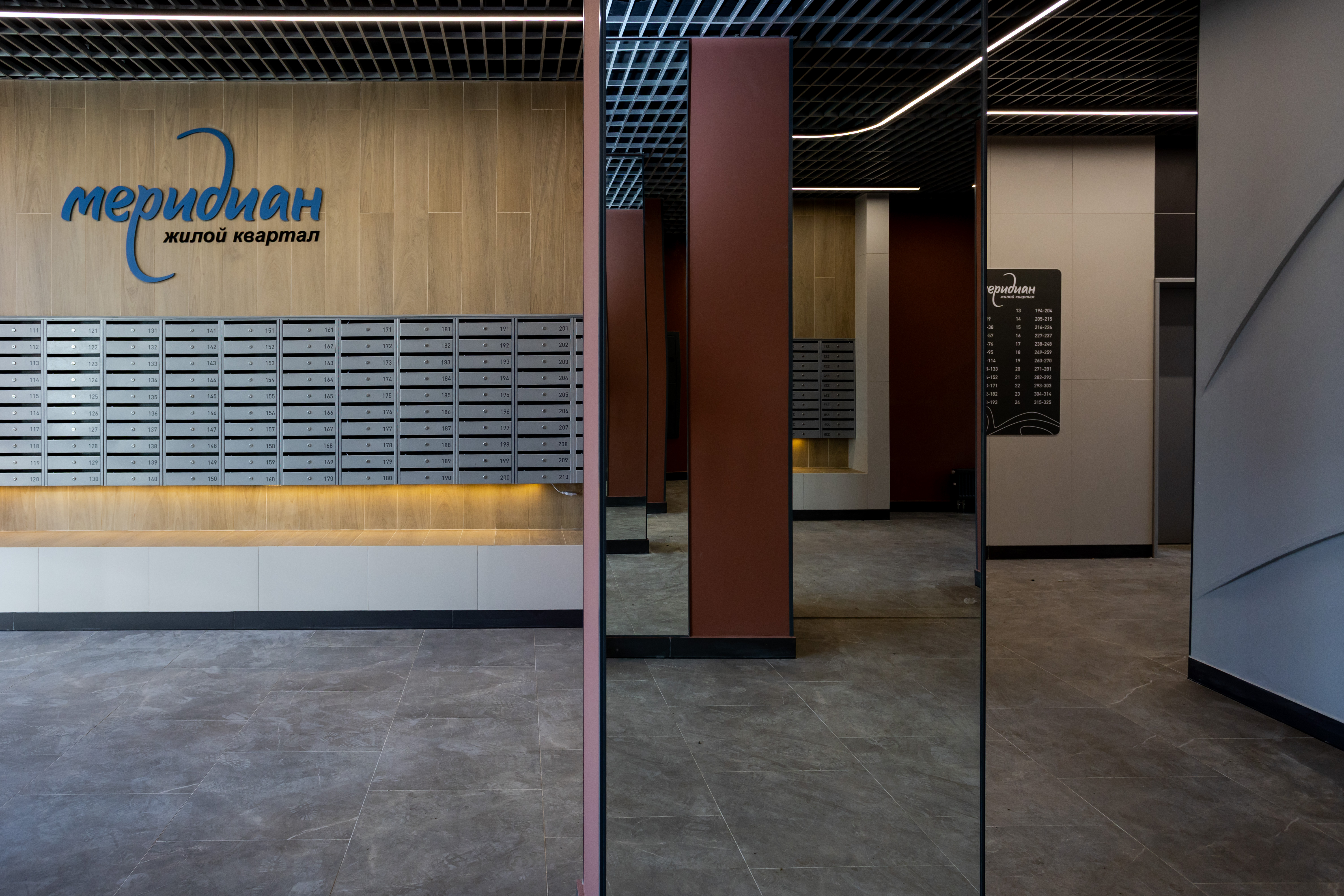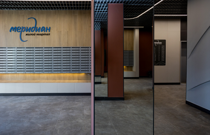 В холлах «Меридиана» много света благодаря прозрачным входным дверям. Заходить в подъезды удобно, потому что нет лишних ступеней – закатить коляску или велосипед не составит труда.